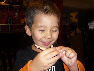 We had lots of fun with pumpkins this year! Jaden love the story "Five Little Pumpkins," and actually, it is still one of his stories of choice at bedtime. He can recite the whole story himself! We also played pumpkin bowling, made a pumpkin necklace, hammered golf tees into pumpkins, made pumpkin and whipped cream sandwiches, made a haunted Halloween house, and of course carved a pumpkin (which Jaden wasn't crazy about) and roasted pumpkin seeds. And Elijah got to taste pumpkin for the first time (actually it was a little recipe from one of Annabel Karmel's books that included pumpkin, orange juice, and cinnamon - he loved it!). We love pumpkins!